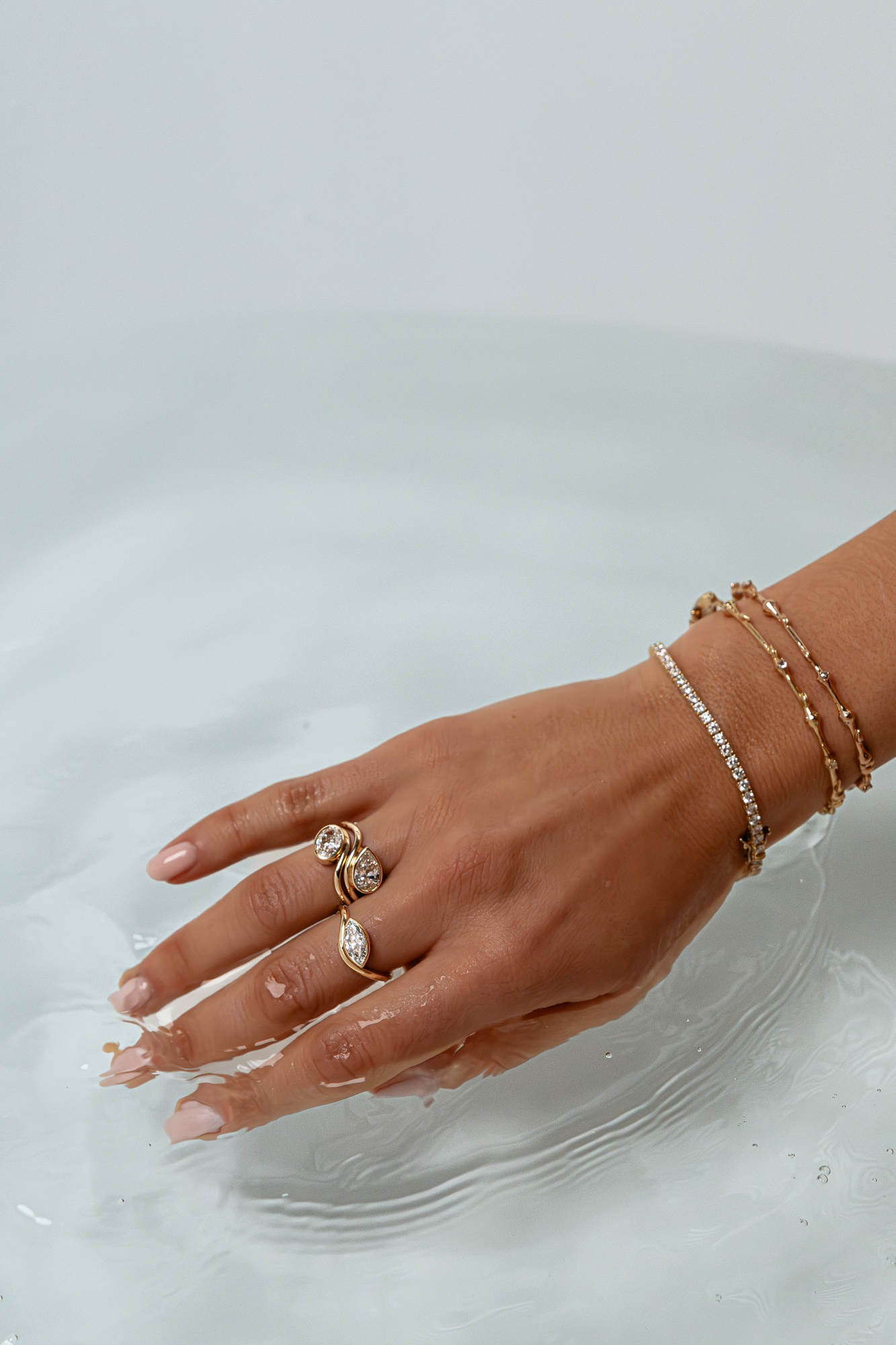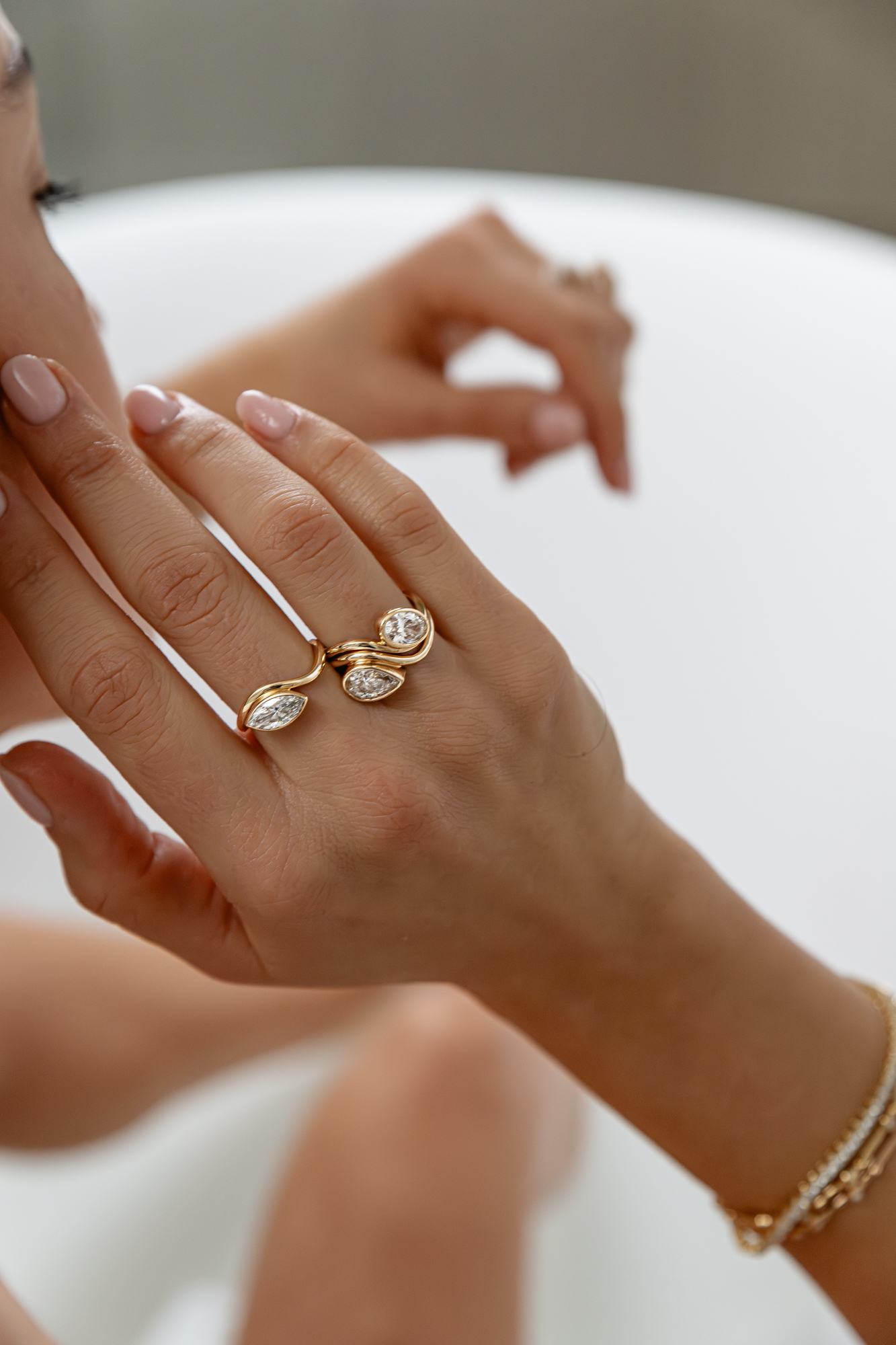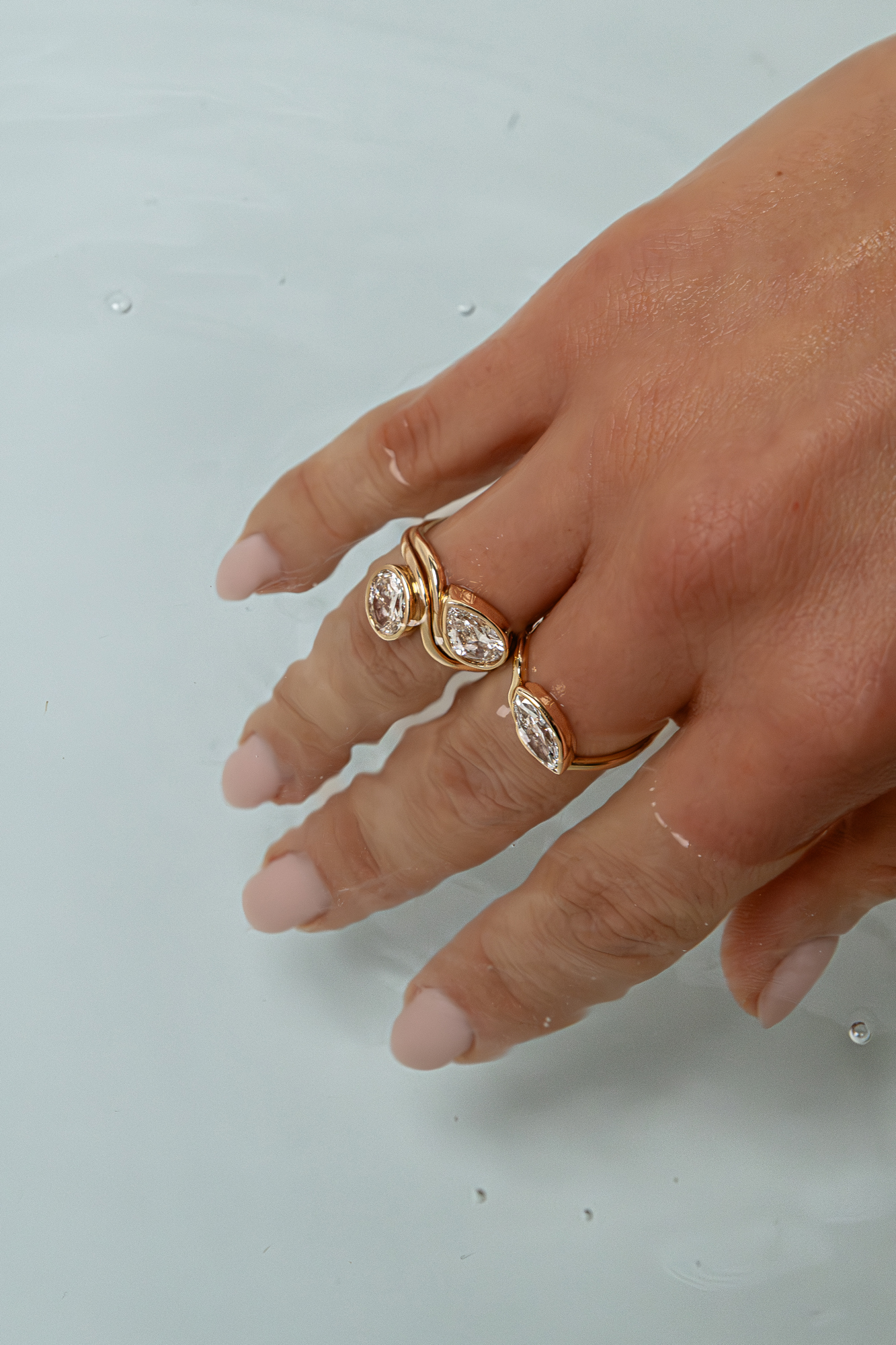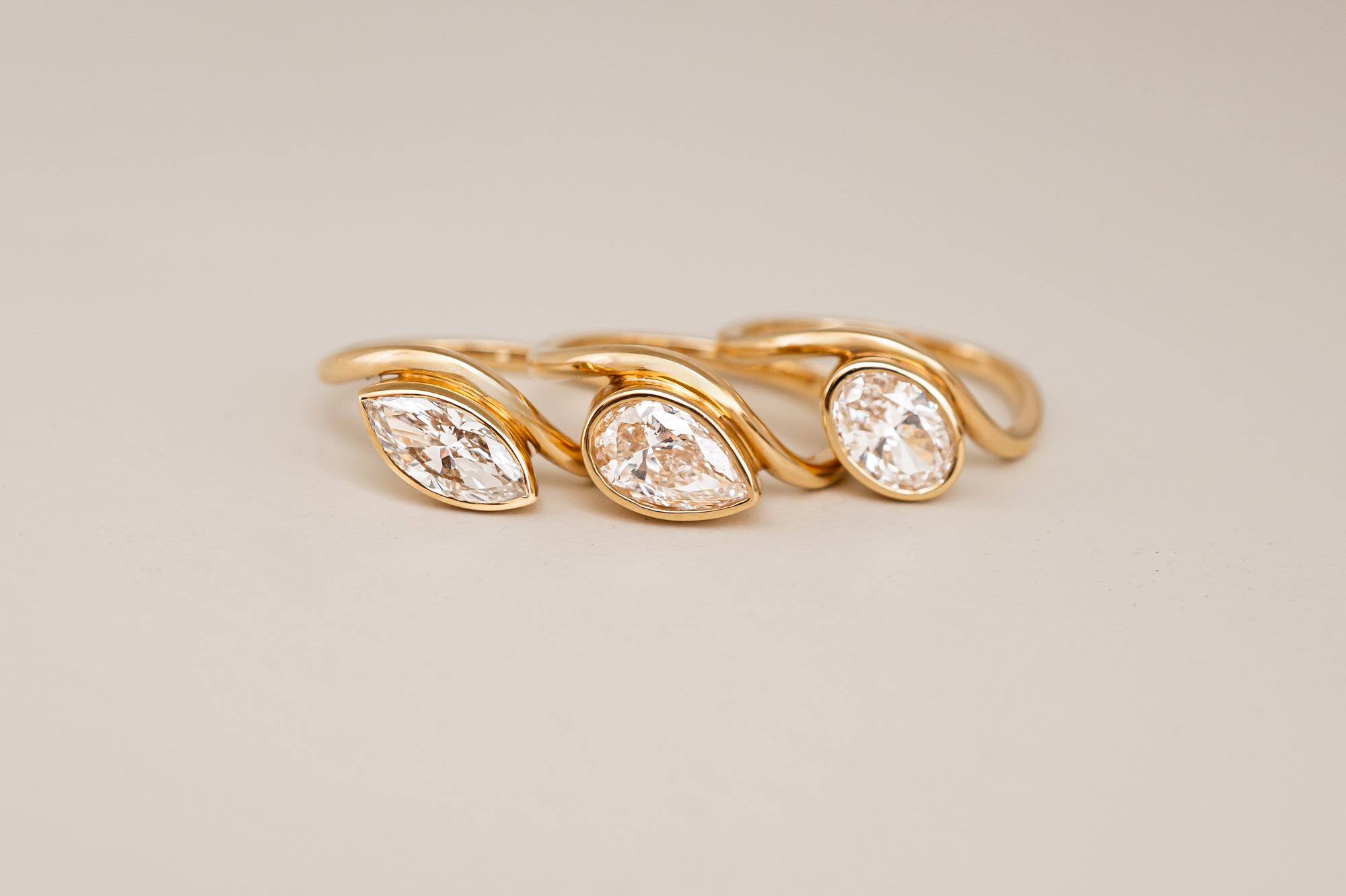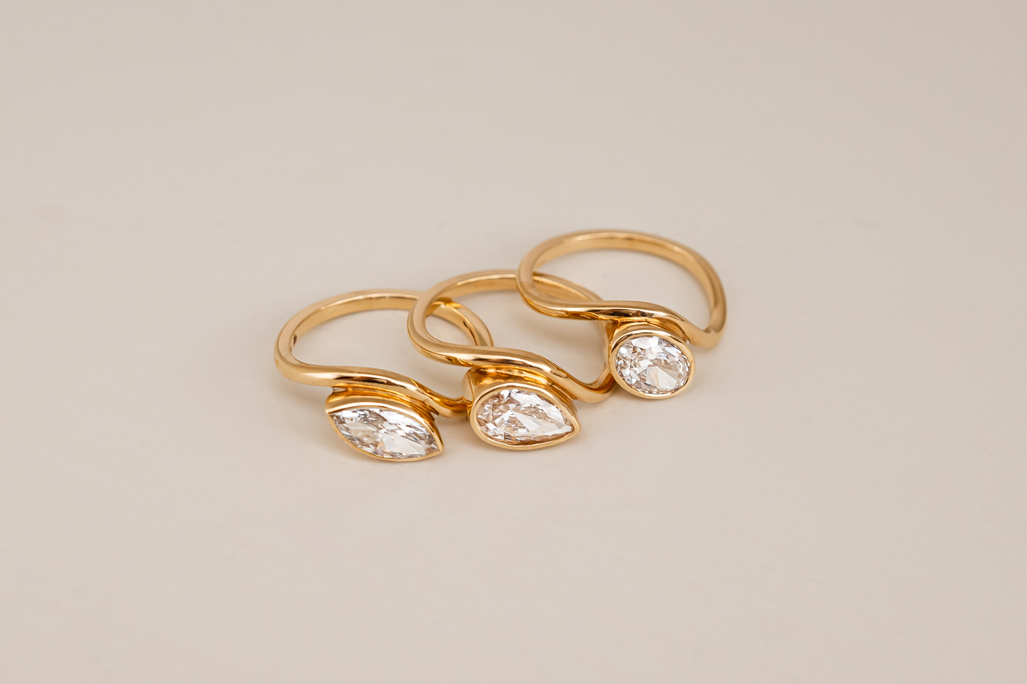 Choose the most trendy ring set with your favourite diamond shape (mention in the comment box marquise/pear/oval). These lab-grown diamonds are set in a bezel setting on a wavy band, which allows you to stack them as you wish.