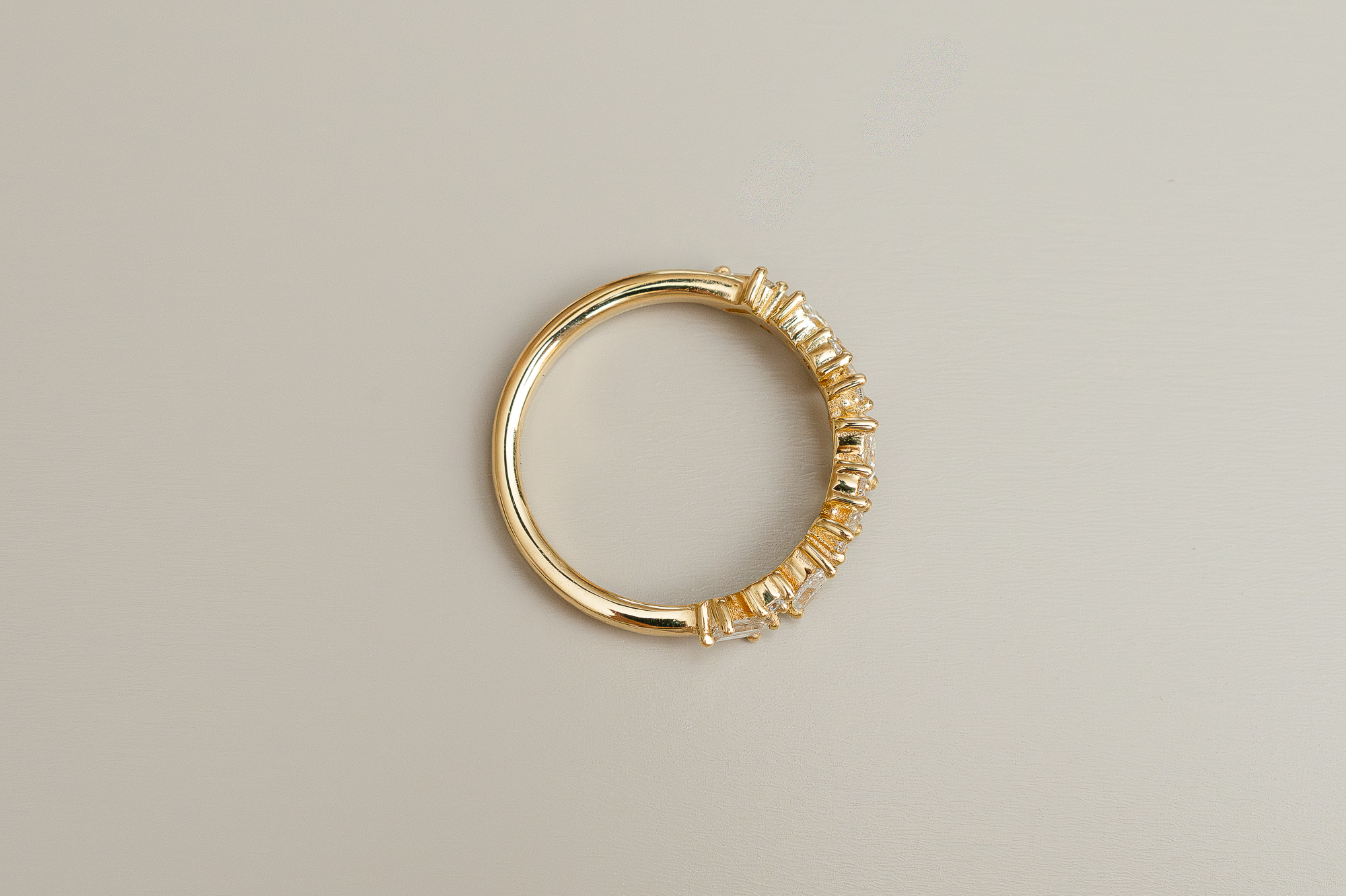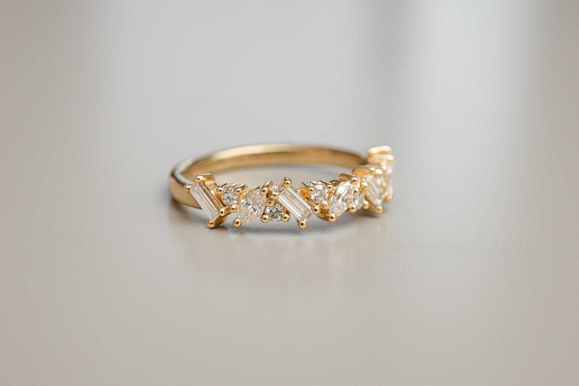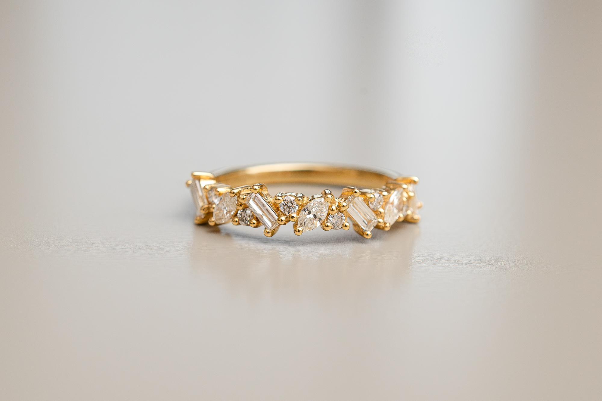 Messy is trendy. We all like a little chaos every now and then, right? The Lea Diamond Band is set with baguette, marquise and round brilliant diamonds of different sizes. The staggered arrangement of the stones gives this band a contemporary look and will draw attention to your finger. Half the band is set with diamonds. Do you want to add more sparkles? Then Laurence will happily set the full band with diamonds for you. Choose the engraving and select your favorite gold color: yellow, rosé or white.