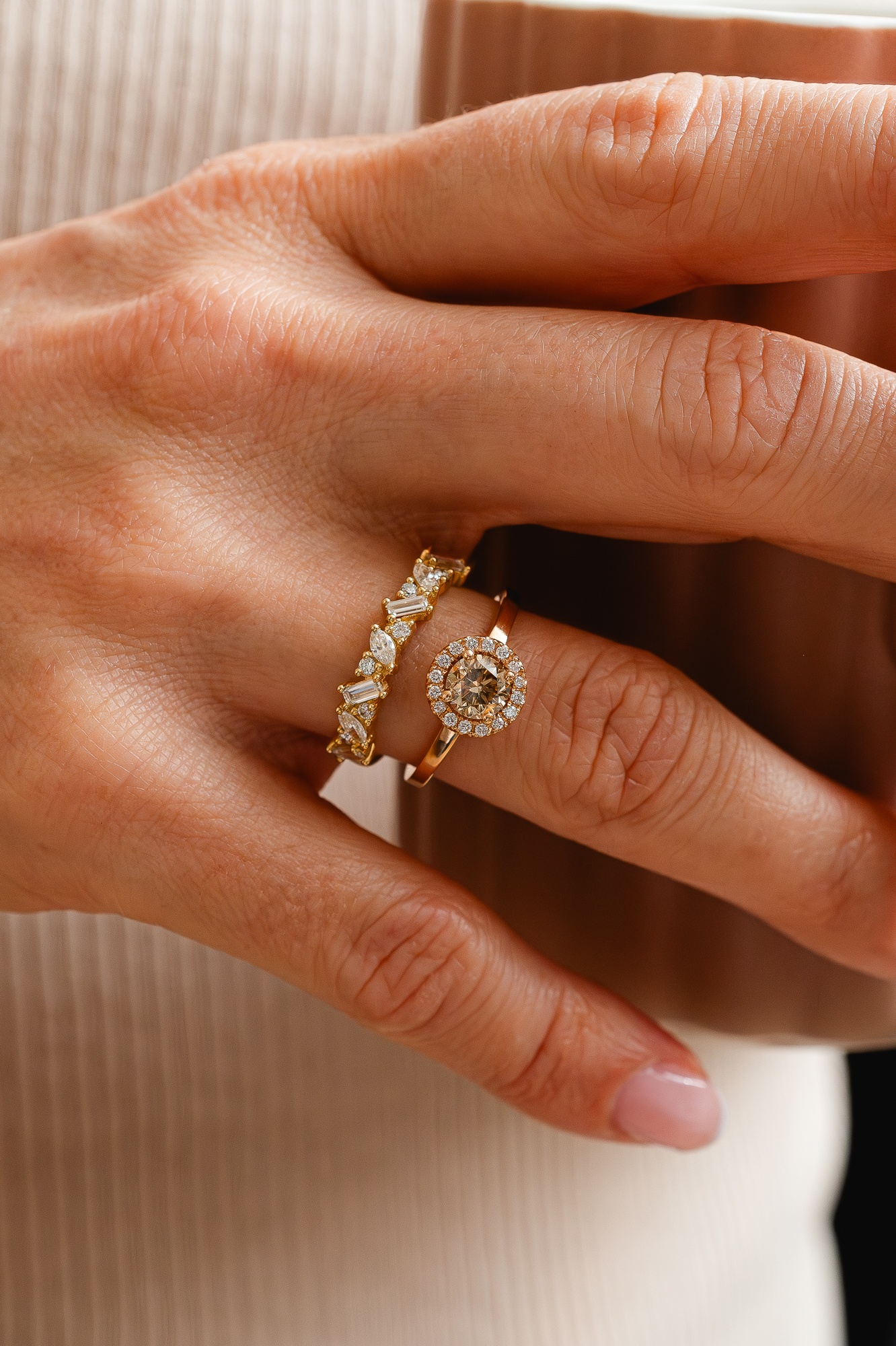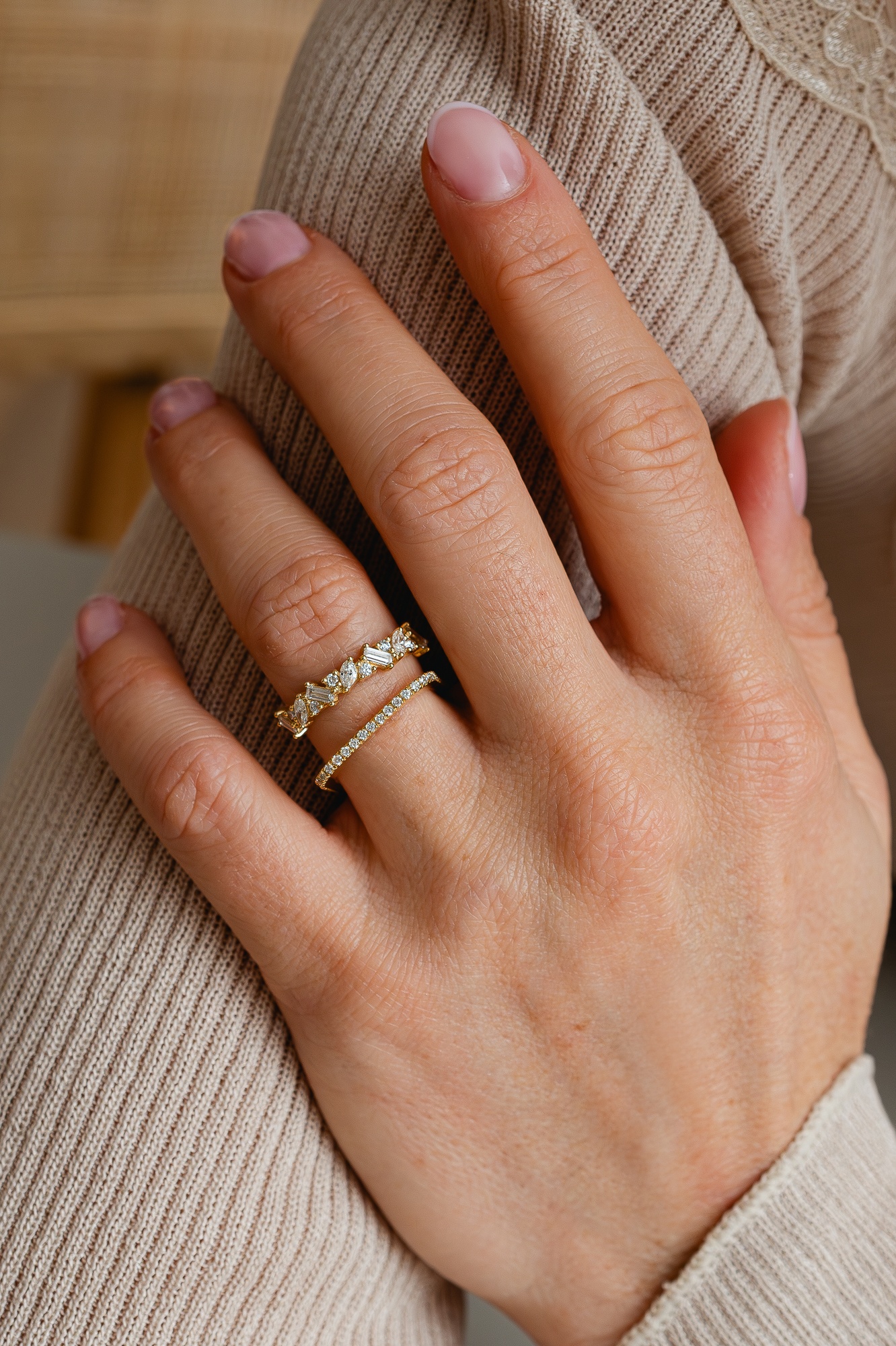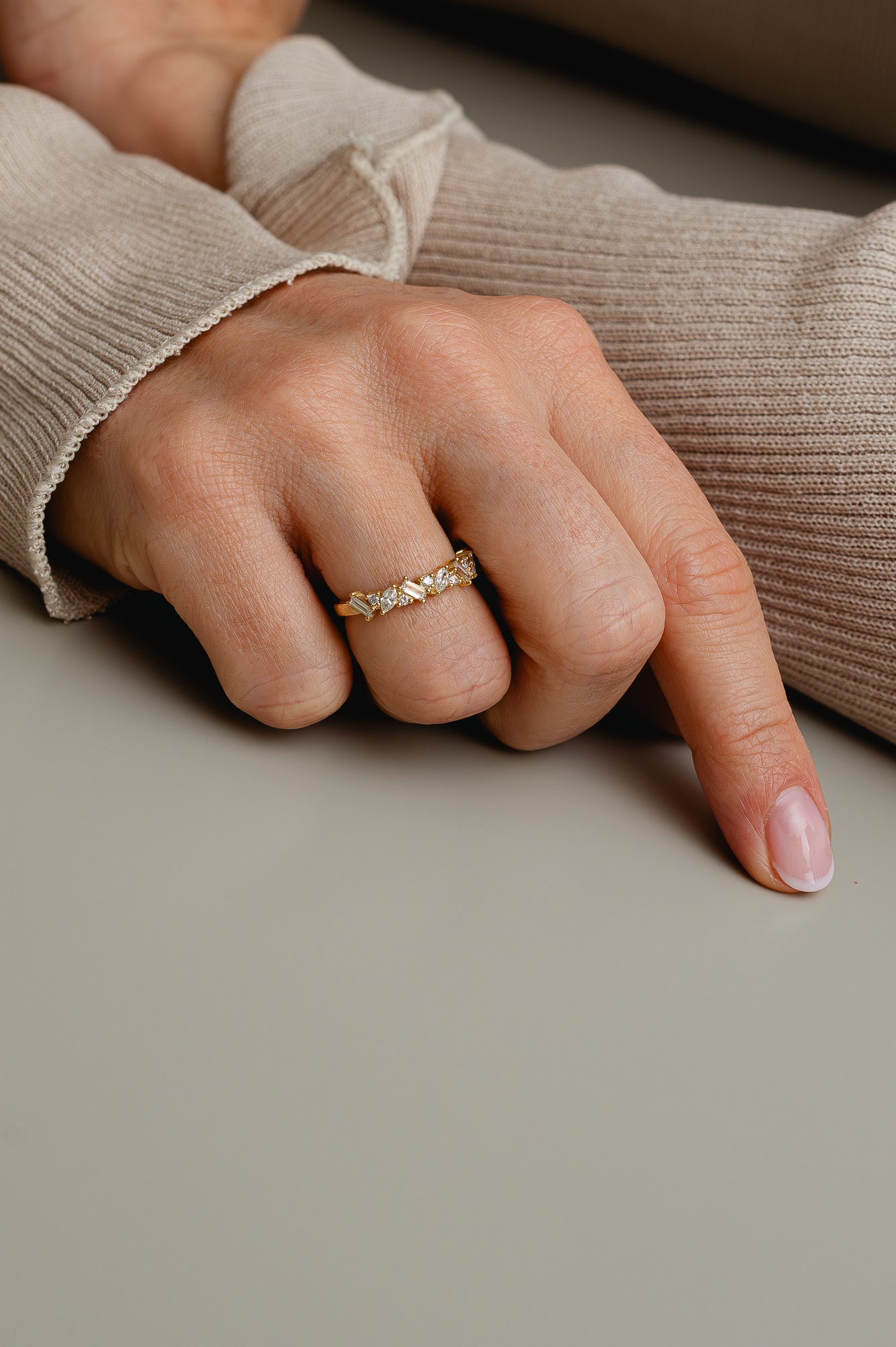 Messy is trendy. We all like a little chaos every now and then, right? The Lea Diamond Band is set with baguette, marquise and round brilliant diamonds of different sizes. The staggered arrangement of the stones gives this band a contemporary look and will draw attention to your finger. Half the band is set with diamonds. Do you want to add more sparkles? Then Laurence will happily set the full band with diamonds for you. Choose the engraving and select your favorite gold color: yellow, rosé or white.